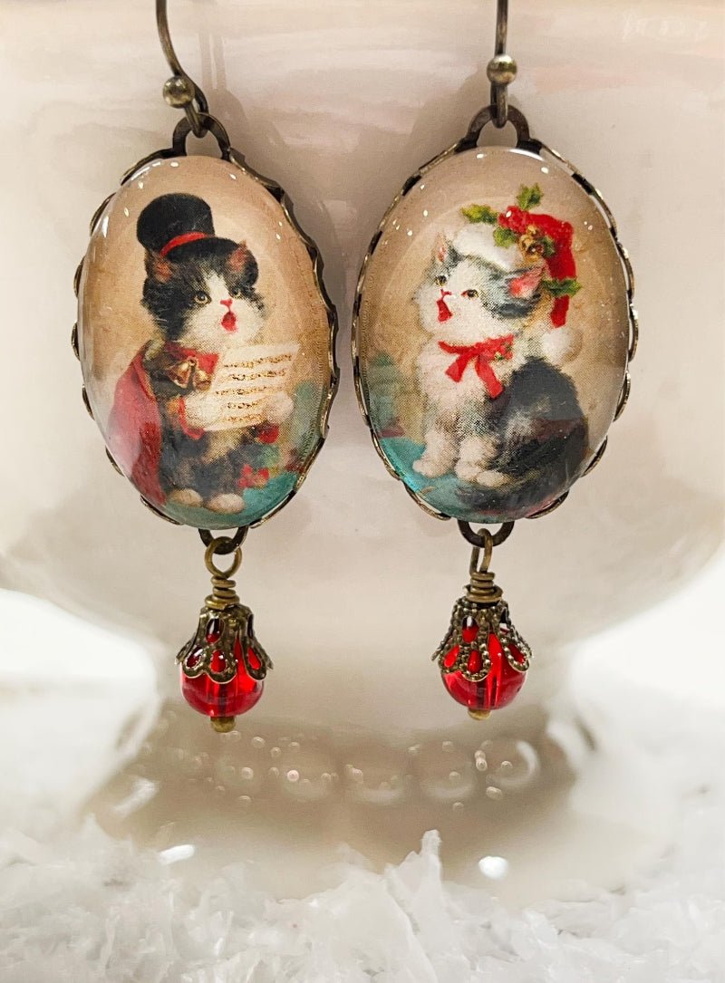 Celebrate the charm of the holidays with Victorian Christmas Cat Earrings. Featuring two dapper cats in festive Victorian attire and a ruby-red crystal drop, these vintage-inspired earrings add elegance and nostalgia to your winter look.